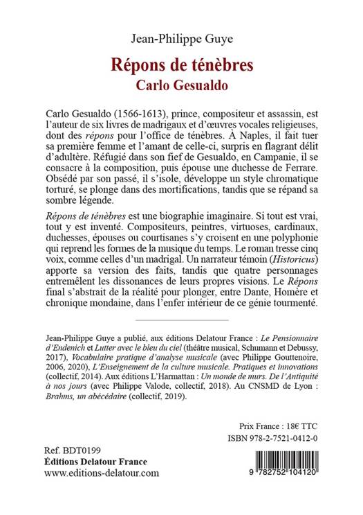 À Naples, il fait tuer sa première femme et l’amant de celle-ci, surpris en flagrant délit d’adultère. Réfugié dans son fief de Gesualdo, en Campanie, il se consacre à la composition, puis épouse une duchesse de Ferrare. Obsédé par son passé, il s’isole, développe un style chromatique torturé, se plonge dans des mortifications, tandis que se répand sa sombre légende. Répons de ténèbres est une biographie imaginaire.