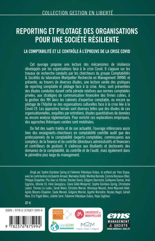 Cet ouvrage propose une lecture des mécanismes de résilience développés par les organisations face à la crise Covid. Il s'appuie sur les travaux de recherche conduits par les chercheurs du groupe Comptabilités & Sociétés du laboratoire Montpellier Recherche en Management (MRM) et présente, au travers de diverses études, une lecture variée des pratiques de reporting comptable et pilotage face à la crise. Ainsi, sont présentées des études conduites durant cette période relatives aux normes comptables privées, aux stratégies de communication financière des firmes cotées, à la gestion des RH dans les cabinets d'expertise comptable, ou encore au pilotage de l'hôpital ou des organisations culturelles face à la crise liée à la Covid-19. Les approches terrain sont diverses telles que des études de cas organisationnelles, enquêtes par entretiens, études quantitatives de données ou encore analyse réglementaire. Pour enrichir ces explorations empiriques, des approches théoriques variées sont mobilisées.