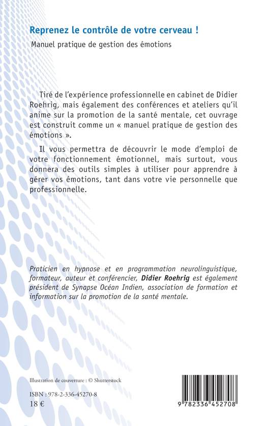 Tiré de l'expérience professionnelle en cabinet de Didier Roehrig, mais également des conférences et ateliers qu'il anime sur la promotion de la santé mentale, cet ouvrage est construit comme un manuel pratique de gestion des émotions . Il vous permettra de découvrir le mode d'emploi de votre fonctionnement émotionnel, mais surtout, vous donnera des outils simples à utiliser pour apprendre à gérer vos émotions, tant dans votre vie personnelle que professionnelle.
