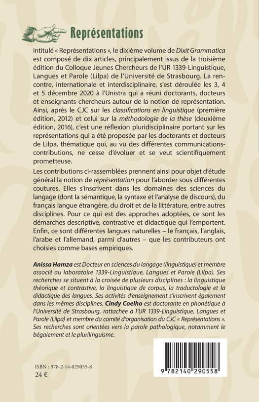 Intitulé « Représentations », le dixième volume de Dixit Grammatica est composé de dix articles, principalement issus de la troisième édition du Colloque Jeunes Chercheurs de l’UR 1339-Linguistique, Langues et Parole (Lilpa) de l’Université de Strasbourg. Les contributions ci-rassemblées prennent ainsi pour objet d’étude général la notion de représentation pour l’aborder sous différentes coutures. Elles s’inscrivent dans les domaines des sciences du langage (dont la sémantique, la syntaxe et l’analyse de discours), du français langue étrangère, du droit et de la littérature, entre autres disciplines. Pour ce qui est des approches adoptées, ce sont les démarches descriptive, contrastive et didactique qui l’emportent. Enfin, ce sont différentes langues naturelles - le français, l’anglais, l’arabe et l’allemand, parmi d’autres - que les contributeurs ont choisies comme bases empiriques.