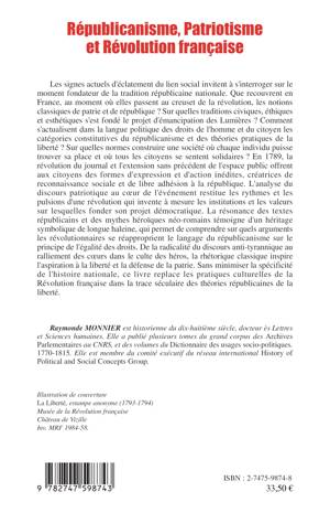 Les signes actuels d'éclatement du lien social invitent à s'interroger sur le moment fondateur de la tradition républicaine nationale. Que recouvrent en France, au moment où elles passent au creuset de la révolution, les notions classiques de patrie et de république ? Sur quelles traditions civiques, éthiques et esthétiques s'est fondé le projet d'émancipation des Lumières ? Ce livre replace les pratiques culturelles de la Révolution française dans la trace séculaire des théories républicaines de la liberté.