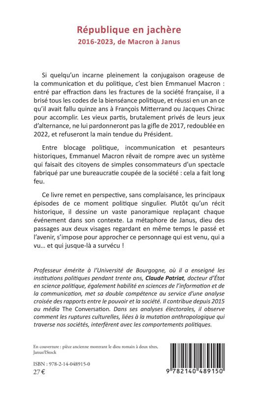 Si quelqu'un incarne pleinement la conjugaison orageuse de la communication et du politique, c'est bien Emmanuel Macron : entré par effraction dans les fractures de la société française, il a brisé tous les codes de la bienséance politique, et réussi en un an ce qu'il avait fallu quinze ans à François Mitterrand ou Jacques Chirac pour accomplir. Les vieux partis, brutalement privés de leurs jeux d'alternance, ne lui pardonneront pas la gifle de 2017, redoublée en 2022, et refuseront la main tendue du Président. Entre blocage politique, incommunication et pesanteurs historiques, Emmanuel Macron rêvait de rompre avec un système qui faisait des citoyens de simples consommateurs d'un spectacle fabriqué par une bureaucratie coupée de la société : cela a fait long feu. Ce livre remet en perspective, sans complaisance, les principaux épisodes de ce moment politique singulier. Plutôt qu'un récit historique, il dessine un vaste panoramique replaçant chaque événement dans son contexte. La métaphore de Janus, dieu des passages aux deux visages regardant en même temps le passé et l'avenir, s'impose pour approcher ce personnage qui est venu, qui a vu et qui jusque-là a survécu !
