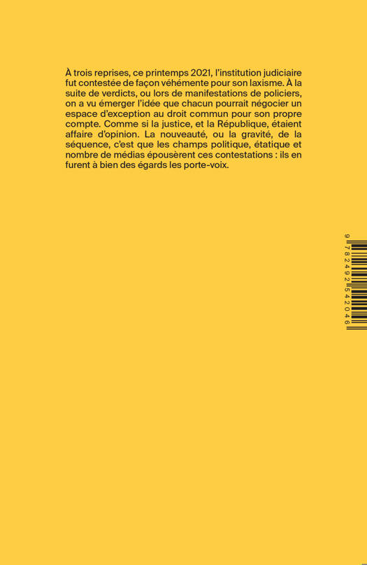À trois reprises ce printemps 2021, l’institution judiciaire fut contestée de façon véhémente pour son laxisme. À la suite de verdicts, ou lors de manifestations de policiers, on a vu émerger l’idée que chacun pourrait négocier un espace d’exception au droit commun pour son propre compte. Comme si la justice, et la République, étaient affaire d’opinion. La nouveauté, ou la gravité, de la séquence, c’est que les champs politique, étatique et nombre de médias épousèrent ces contestations : ils en furent à bien des égards les porte-voix. Ce sont ces trois textes qu’AOC a voulu réunir en un volume pour en faire l’un de ses « Imprimés ».
