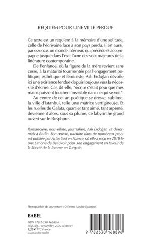 Ce texte est un requiem à la mémoire d'une solitude, celle de l'écrivaine face à son pays perdu. Il est aussi, par essence, un monde intérieur, qui précède et accompagne jusque dans l'exil l'une des voix majeures de la littérature contemporaine. De l'enfance, où la figure de la mère revient sans cesse, à la maturité tourmentée par l'engagement politique, esthétique et féministe, Aslı Erdogan dévoile ici une existence tendue depuis toujours vers la nécessité d'écrire. Car, dit-elle, "écrire c'était pour que mes mains puissent toucher l'invisible dans ce qui se voit". Au centre de cet art poétique se dresse, sublime, la ville d'Istanbul, telle une matrice vertigineuse. Et les ruelles de Galata, quartier tant aimé, tant arpenté, deviennent alors, sous sa plume, ce labyrinthe grand ouvert sur le Bosphore.