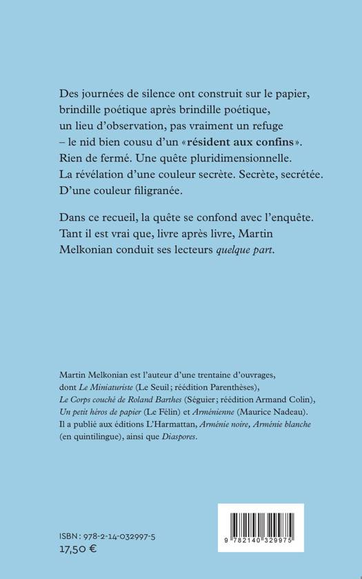 Des journées de silence ont construit sur le papier, brindille poétique après brindille poétique, un lieu d'observation, pas vraiment un refuge le nid bien cousu d'un « résident aux confins ». Rien de fermé. Une quête pluridimensionnelle. La révélation d'une couleur secrète. Secrète, secrétée. D'une couleur filigranée. Dans ce recueil, la quête se confond avec l'enquête. Tant il est vrai que, livre après livre, Martin Melkonian conduit ses lecteurs quelque part.
