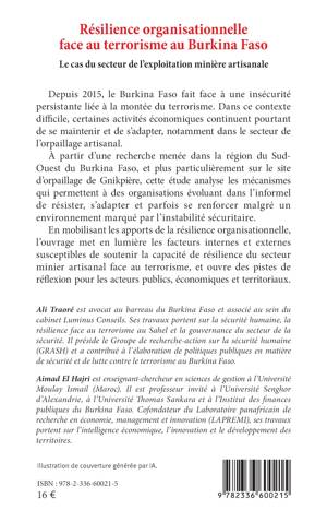 Depuis 2015, le Burkina Faso fait face à une insécurité persistante liée à la montée du terrorisme. Dans ce contexte difficile, certaines activités économiques continuent pourtant de se maintenir et de s'adapter, notamment dans le secteur de l'orpaillage artisanal. À partir d'une recherche menée dans la région du Sud-Ouest du Burkina Faso, et plus particulièrement sur le site d'orpaillage de Gnikpière, cette étude analyse les mécanismes qui permettent à des organisations évoluant dans l'informel de résister, s'adapter et parfois se renforcer malgré un environnement marqué par l'instabilité sécuritaire. En mobilisant les apports de la résilience organisationnelle, l'ouvrage met en lumière les facteurs internes et externes susceptibles de soutenir la capacité de résilience du secteur minier artisanal face au terrorisme, et ouvre des pistes de réflexion pour les acteurs publics, économiques et territoriaux.