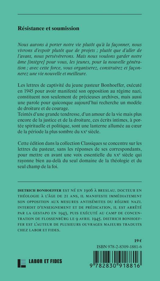 Les lettres de captivité du jeune pasteur Bonhoeffer, exécuté en 1945 pour avoir manifesté sans ambiguïté son opposition au régime nazi, constitue non seulement de précieuses archives mais aussi une parole pour quiconque aujourd’hui recherche un modèle de droiture et de courage. De son arrestation à la menace toujours plus précise de son exécution, le jeune pasteur partage avec ses proches, dont au premier plan sa toute jeune fiancée Maria, tout à la fois ses doutes et l’intransigeance de son engagement sur lequel il ne reviendra jamais. Teintées d’une grande tendresse, d’un amour de la vie mais plus encore de la justice et de la droiture, ces écrits intimes sont une lanterne allumée au cœur de la période la plus sombre du XXe siècle. Cette édition dans la collection Classiques se concentre sur les seules lettres du pasteur, sans les réponses de ses correspondant, pour mettre en avant une voix essentielle du XXe siècle qui rayonne bien au-delà du seul domaine de la théologie et du seul champ de la foi.
