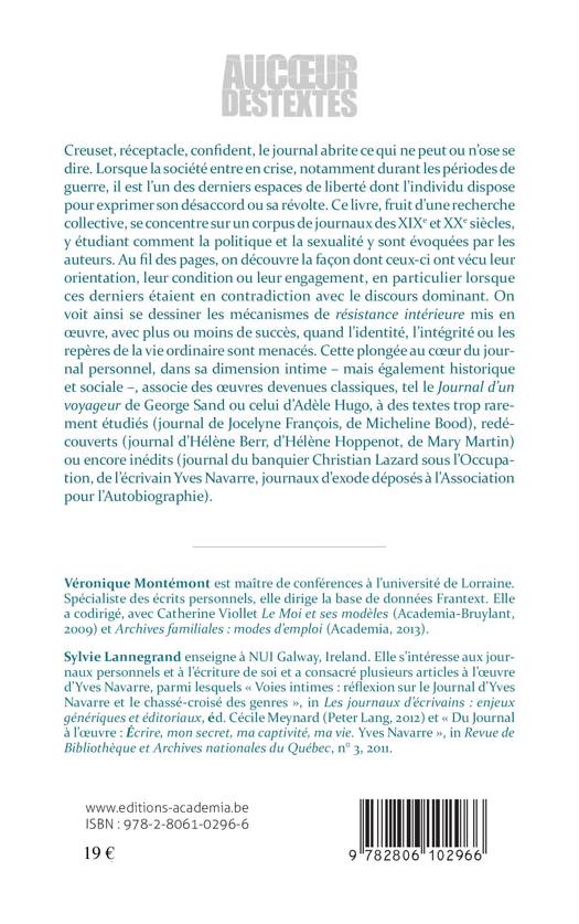 Creuset, réceptacle, confident, le journal abrite ce qui ne peut ou n'ose se dire. Lorsque la société entre en crise, notamment durant les périodes de guerre, il est l'un des derniers espaces de liberté dont l'individu dispose pour exprimer son désaccord ou sa révolte. Ce livre, fruit d'une recherche collective, se concentre sur un corpus de journaux des XIXe et XXe siècles, y étudiant comment la politique et la sexualité y sont évoquées par les auteurs.