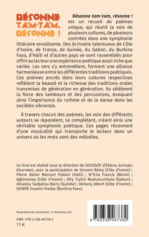 Résonne tam-tam, résonne ! est un recueil de poèmes unique, qui réunit la voix de plusieurs cultures, de plusieurs contrées dans une symphonie littéraire envoûtante. Des Écrivains talentueux de Côte d'Ivoire, de France, de Guinée, du Gabon, du Burkina Faso, d'Haïti... se sont rassemblés pour offrir au lecteur une expérience poétique aussi riche que variée. Les vers s'y entremêlent, formant une alliance harmonieuse entre les différentes traditions poétiques. Ces poèmes ancrés dans leurs Cultures respectives reflètent la beauté et la richesse des traditions orales transmises de génération en génération. Ils célèbrent la force des tambours et des percussions, évoquant ainsi l'importance du rythme et de la danse dans les sociétés vibrantes. À travers chacun des poèmes, les voix des différents auteurs se répondent, se complètent, créant ainsi une véritable symphonie poétique. Ces pages résonnent d'une musicalité qui transporte le lecteur dans un univers où les mots sont des mélodies.
