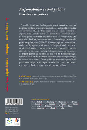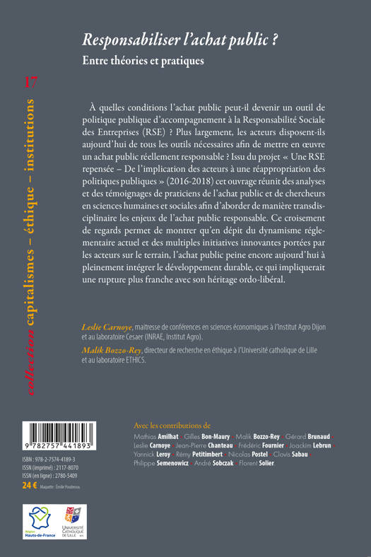 À quelles conditions l’achat public peut-il devenir un outil de politique publique d’accompagnement à la Responsabilité Sociale des Entreprises (RSE) ? Plus largement, les acteurs disposent-ils aujourd’hui de tous les outils nécessaires afin de mettre en oeuvre un achat public réellement responsable ? Issu du projet « Une RSE repensée – De l’implication des acteurs à une réappropriation des politiques publiques » (2016-2018) cet ouvrage réunit des analyses et des témoignages de praticiens de l’achat public et de chercheurs en sciences humaines et sociales afin d’aborder de manière transdisciplinaire les enjeux de l’achat public responsable. Ce croisement de regards permet de montrer qu’en dépit du dynamisme réglementaire actuel et des multiples initiatives innovantes portées par les acteurs sur le terrain, l’achat public peine encore aujourd’hui à pleinement intégrer le développement durable, ce qui impliquerait une rupture plus franche avec son héritage ordo-libéral.