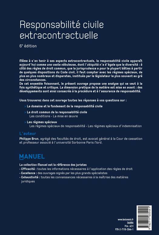 Même à s'en tenir à ses aspects extracontractuels, la responsabilité civile apparaît aujourd'hui comme une vaste nébuleuse, dont l'ubiquité n'a d'égale que la diversité : à côté des règles de droit commun, que la jurisprudence a pour la plupart bâties à partir de quelques dispositions du Code civil, il faut compter avec les régimes spéciaux, de plus en plus nombreux et disparates, institués par le législateur le plus souvent au gré des circonstances. De cet ensemble foisonnant, le présent ouvrage propose une analyse qui se veut à la fois synthétique et critique. La dimension pratique de la matière est mise en avant : des développements sont ainsi consacrés à la procédure et à l'assurance de responsabilité.