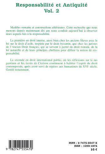 "La responsabilité liée au droit d'asile dans la plus ancienne loi slave" et "esquisse de l'influence du droit romain sur la notion de responsabilité civile au XVIIe et XVIIIe siècle". Deux articles qui analysent la place d'un modèle par rapport à une construction ultérieure. La deuxième partie s'intéresse à la responsabilité au droit international.