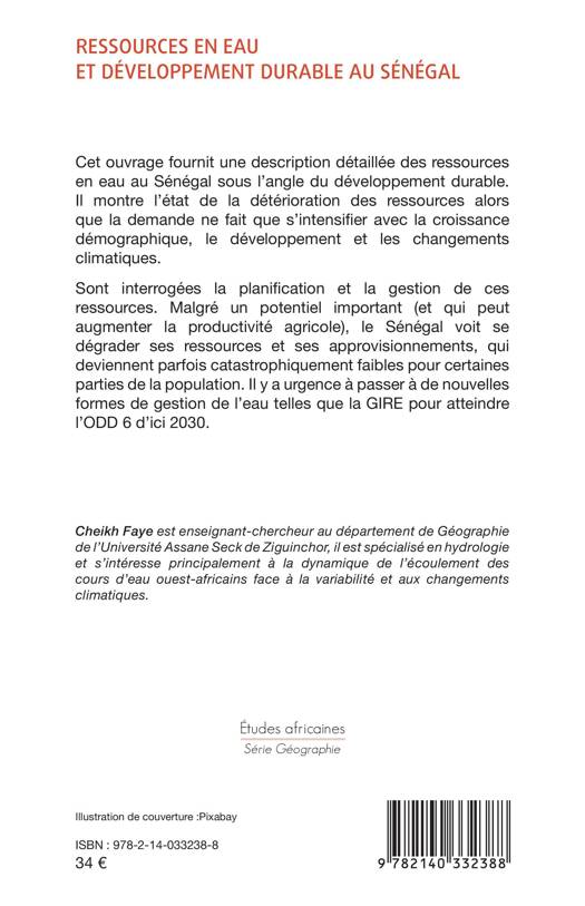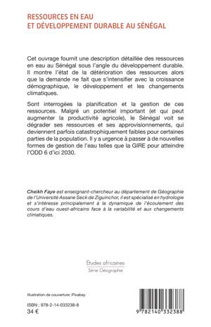 Cet ouvrage fournit une description détaillée des ressources en eau au Sénégal sous l'angle du développement durable. Il montre l'état de la détérioration des ressources alors que la demande ne fait que s'intensifier avec la croissance démographique, le développement et les changements climatiques. Sont interrogées la planification et la gestion de ces ressources. Malgré un potentiel important (et qui peut augmenter la productivité agricole), le Sénégal voit se dégrader ses ressources et ses approvisionnements, qui deviennent parfois catastrophiquement faibles pour certaines parties de la population. Il y a urgence à passer à de nouvelles formes de gestion de l'eau telles que la GIRE pour atteindre l'ODD 6 d'ici 2030.