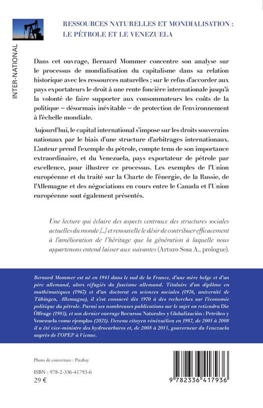 Dans cet ouvrage, Bernard Mommer concentre son analyse sur le processus de mondialisation du capitalisme dans sa relation historique avec les ressources naturelles ; sur le refus d’accorder aux pays exportateurs le droit à une rente foncière internationale jusqu’à la volonté de faire supporter aux consommateurs les coûts de la politique – désormais inévitable – de protection de l’environnement à l’échelle mondiale. Aujourd’hui, le capital international s’impose sur les droits souverains nationaux par le biais d’une structure d’arbitrages internationaux. L’auteur prend l’exemple du pétrole, compte tenu de son importance extraordinaire, et du Venezuela, pays exportateur de pétrole par excellence, pour illustrer ce processus. Les exemples de l’Union européenne et du traité sur la Charte de l’énergie, de la Russie, de l’Allemagne et des négociations en cours entre le Canada et l’Union européenne sont également présentés.