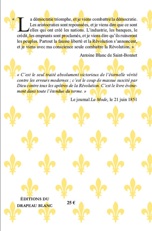 La démocratie triomphe, et je viens combattre la démocratie. Les aristocraties sont repoussées, et je viens dire que ce sont elles qui ont créé les nations. L'industrie, les banques, le crédit, les emprunts sont proclamés, et je viens dire qu'ils ruineront les peuples. Partout la fausse liberté et la Révolution s'annoncent, et je viens avec ma conscience seule combattre la Révolution. Antoine Blanc de Saint-Bonnet C'est le seul traité absolument victorieux de l'éternelle vérité contre les erreurs modernes , c'est le coup de massue suscité par Dieu contre tous les apôtres de la Révolution. C'est le livre événement dans toute l'étendue du terme. Le journal La Mode, le 21 juin 1851.