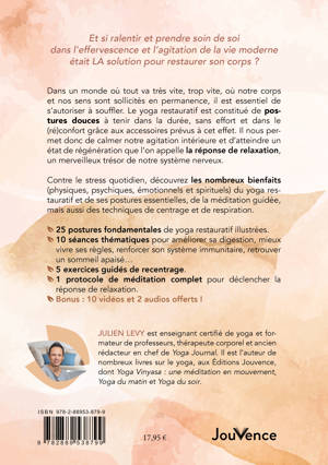 Dans un monde où tout va très vite, trop vite, où notre corps et nos sens sont sollicités en permanence, il est essentiel de s’autoriser à souffler. Le yoga restauratif est constitué de postures douces à tenir dans la durée, sans effort et dans le (ré)confort grâce aux accessoires prévus à cet effet. Il nous permet donc de calmer notre agitation intérieure et d’atteindre un état de régénération que l’on appelle la réponse de relaxation, un merveilleux trésor de notre système nerveux. Contre le stress quotidien, découvrez les nombreux bienfaits (physiques, psychiques, émotionnels et spirituels) du yoga restauratif et de ses postures essentielles, de la méditation guidée, mais aussi des techniques de centrage et de respiration. 25 postures fondamentales de yoga restauratif illustrées. 10 séances thématiques pour améliorer sa digestion, mieux vivre ses règles, renforcer son système immunitaire, retrouver un sommeil apaisé… 5 exercices guidés de recentrage. 1 protocole de méditation complet pour déclencher la réponse de relaxation. Bonus : 10 vidéos et 2 audios offerts !