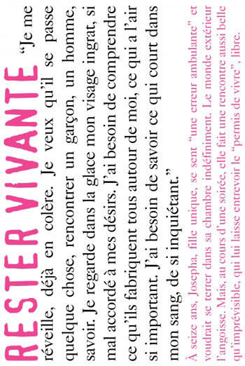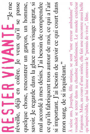 À seize ans, Josepha, fille unique, se sent « une erreur ambulante » et voudrait se terrer dans sa chambre indéfiniment. Le monde extérieur l'angoisse. Mais, au cours d'une soirée, elle fait une rencontre aussi belle qu'imprévisible, qui lui laisse entrevoir le « permis de vivre », libre.