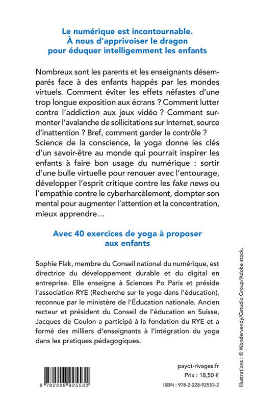 Le numérique est incontournable. À nous d'apprivoiser le dragon pour éduquer intelligemment les enfants ! Nombreux sont les parents et les enseignants désemparés face à des enfants happés par les mondes virtuels. Comment éviter les effets néfastes d'une trop longue exposition aux écrans ? Comment lutter contre l'addiction aux jeux vidéo ? Comment surmonter l'avalanche de sollicitations sur Internet, source d'inattention ? Bref, comment garder le contrôle ? Science de la conscience, le yoga donne les clés d'un savoir-être au monde qui pourrait inspirer les enfants à faire bon usage du numérique : sortir d'une bulle virtuelle pour renouer avec l'entourage, développer l'esprit critique contre les «fake news» ou l'empathie contre le cyberharcèlement, dompter son mental pour augmenter l'attention et la concentration, mieux apprendre...