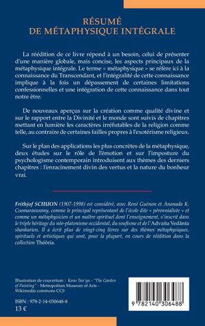 La réédition de ce livre répond à un besoin, celui de présenter d'une manière globale, mais concise, les aspects principaux de la métaphysique intégrale. Le terme « métaphysique » se réfère ici à la connaissance du Transcendant, et l'intégralité de cette connaissance implique à la fois un dépassement de certaines limitations confessionnelles et une intégration de cette connaissance dans tout notre être. De nouveaux aperçus sur la création comme qualité divine et sur le rapport entre la Divinité et le monde sont suivis de chapitres mettant en lumière les caractères irréfutables de la religion comme telle, au contraire de certaines failles propres à l'exotérisme religieux. Sur le plan des applications les plus concrètes de la métaphysique, deux études sur le rôle de l'émotion et sur l'imposture du psychologisme contemporain introduisent aux thèmes des derniers chapitres : l'enracinement divin des vertus et la nature du bonheur vrai.
