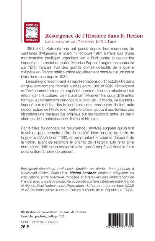 1961-2021. Soixante ans ont passé depuis les massacres de centaines d'Algériens le mardi 17 octobre 1961 à Paris lors d'une manifestation pacifique organisée par le FLN contre le couvre-feu imposé par le préfet de police Maurice Papon. Longtemps camouflé par l'État français, l'un des grands crimes collectifs de la guerre d'Algérie en France refait surface régulièrement dans la culture par le biais du roman depuis 1982. L'essai explore comment les représentations du 17 octobre 61 dans vingt-quatre romans français publiés entre 1982 et 2012, témoignent de l'évènement historique empêché comme discours refoulé qui fait retour dans la culture. En naturalisant l'évènement sous différentes formes, les romanciers dénoncent le bilan de 3 morts, 64 blessés imposé aux médias dès le lendemain des massacres. Ils font acte de correction de l'Histoire officielle forclose, ajoutant aux travaux des historiens une perspective originale sur les rapports entre les deux champs de la connaissance, fiction et Histoire. Par le biais du concept de résurgence, l'analyse suggère qu'un lent travail de postmémoire infiltre la société bien au-delà de la fin de la guerre d'Algérie en 1962, en empruntant le chemin détourné de la fiction, avant de rejoindre le champ de l'Histoire. Elle rend ainsi compte de l'infiltration souterraine du passé empêché dans le futur de la culture à partir du présent