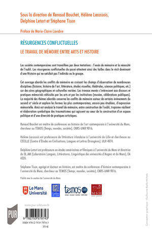 Cet ouvrage aborde les conflits de mémoire en croisant les champs d’observation de nombreuses disciplines (histoire, histoire de l’art, littérature, études visuelles, théâtrales, sciences politiques, etc.) sur des aires géographiques et culturelles variées. Les travaux menés s’intéressent aux pratiques et aux discours mémoriels véhiculés par les arts et par les institutions (musées, célébrations publiques). La majorité des thèmes abordés concerne les conflits de mémoire autour de certains évènements du second XXe siècle et explore les formes les plus contemporaines, encore peu étudiées, d’expression mémorielle.