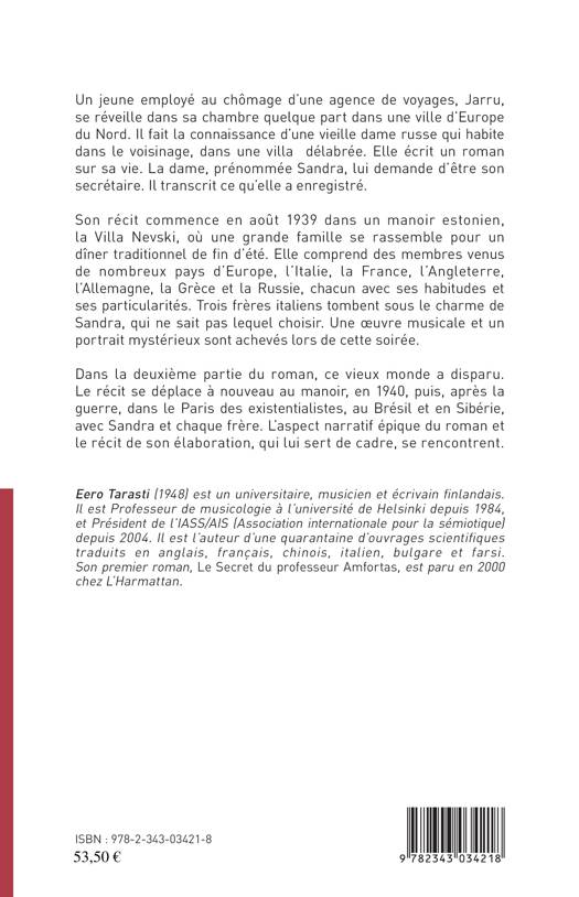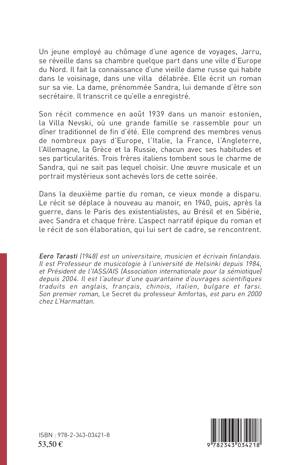 Jarru fait la connaissance d'une vieille dame russe, prénommée Sandra, qui habite dans le voisinage. Elle écrit un roman sur sa vie. Jarru, au chômage, devient alors son secrétaire. Il transcrit ce qu'elle a enregistré. Son récit commence en août 1939 dans un manoir estonien, la Villa Nevski, où une grande famille se rassemble pour un dîner traditionnel de fin d'été. Elle comprend des menbres venus de nombreux pays d'Europe...