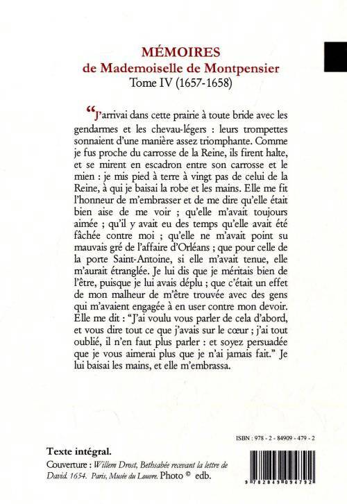 « J'arrivai dans cette prairie à toute bride avec les gendarmes et les chevau-légers : leurs trompettes sonnaient d'une manière assez triomphante. Comme je fus proche du carrosse de la Reine, ils firent halte, et se mirent en escadron entre son carrosse et le mien : je mis pied à terre à vingt pas de celui de la Reine, à qui je baisai la robe et les mains. Elle me fit l'honneur de m'embrasser et de me dire qu'elle était bien aise de me voir ; qu'elle m'avait toujours aimée ; qu'il y avait eu des temps qu'elle avait été fâchée contre moi ; qu'elle ne m'avait point su mauvais gré de l'affaire d'Orléans ; que pour celle de la porte Saint-Antoine, si elle m'avait tenue, elle m'aurait étranglée. Je lui dis que je méritais bien de l'être, puisque je lui avais déplu ; que c'était un effet de mon malheur de m'être trouvée avec des gens qui m'avaient engagée à en user contre mon devoir. Elle me dit : " J'ai voulu vous parler de cela d'abord, et vous dire tout ce que j'avais sur le coeur ; j'ai tout oublié, il n'en faut plus parler : et soyez persuadée que je vous aimerai plus que je n'ai jamais fait. ". Je lui baisai les mains, et elle m'embrassa. »