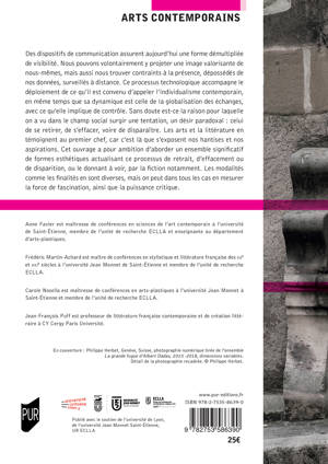 Des dispositifs de communication assurent aujourd'hui une forme démultipliée de visibilité. Nous pouvons volontairement y projeter une image valorisante de nous-mêmes, mais aussi nous trouver contraints à la présence, dépossédés de nos données, surveillés à distance. Ce processus technologique accompagne le déploiement de ce qu'il est convenu d'appeler l'individualisme contemporain, en même temps que sa dynamique est celle de la globalisation des échanges, avec ce qu'elle implique de contrôle. Sans doute est-ce la raison pour laquelle on a vu dans le champ social surgir une tentation, un désir paradoxal : celui de se retirer, de s'effacer, voire de disparaître. Les arts et la littérature en témoignent au premier chef, car c'est là que s'exposent nos hantises et nos aspirations. Cet ouvrage a pour ambition d'aborder un ensemble significatif de formes esthétiques actualisant ce processus de retrait, d'effacement ou de disparition, ou le donnant à voir, par la fiction notamment. Les modalités comme les finalités en sont diverses, mais on peut dans tous les cas en mesurer la force de fascination, ainsi que la puissance critique.