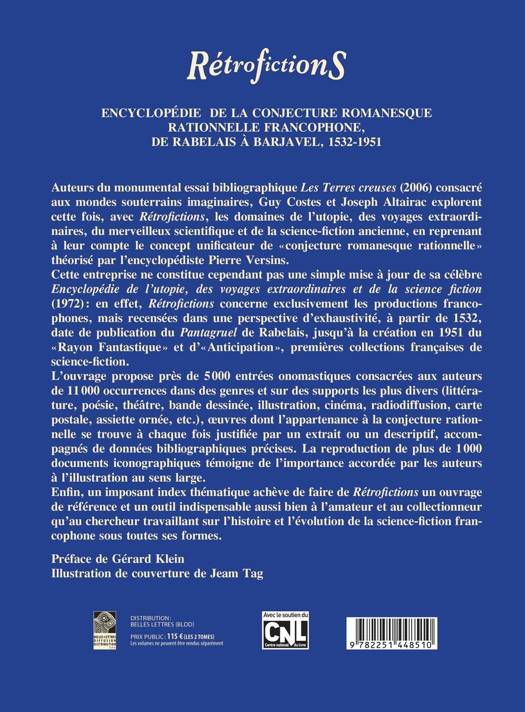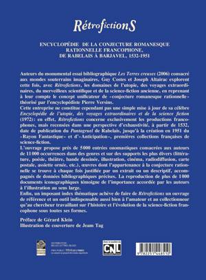Auteurs du monumental essai bibliographique Les Terres creuses (2006) consacré aux mondes souterrains imaginaires, Guy Costes et Joseph Altairac explorent cette fois, avec Rétrofictions, les domaines de l'utopie, des voyages extraordinaires, du merveilleux scientifique et de la science-fiction ancienne, en reprenant à leur compte le concept unificateur de « conjecture romanesque rationnelle » théorisé par l'encyclopédiste Pierre Versins. Cette entreprise ne constitue cependant pas une simple mise à jour de sa célèbre Encyclopédie de l'utopie, des voyages extraordinaires et de la science fiction (1972) : en effet, Rétrofictions concerne exclusivement les productions francophones, mais recensées dans une perspective d'exhaustivité, à partir de 1532, date de publication du Pantagruel de Rabelais, jusqu'à la création en 1951 du « Rayon Fantastiquec» et d' « Anticipation », premières collections françaises de science-fiction. L'ouvrage propose près de 5000 entrées onomastiques consacrées aux auteurs de 11000 occurrences dans des genres et sur des supports les plus divers (littérature, poésie, théâtre, bande dessinée, illustration, cinéma, radiodiffusion, carte postale, assiette ornée, etc.), oeuvres dont l'appartenance à la conjecture rationnelle se trouve à chaque fois justifiée par un extrait ou un descriptif, accompagnés de données bibliographiques précises. La reproduction de plus de 1000 documents iconographiques témoigne de l'importance accordée par les auteurs à l'illustration au sens large. Enfin, un imposant index thématique achève de faire de Rétrofictions un ouvrage de référence et un outil indispensable aussi bien à l'amateur et au collectionneur qu'au chercheur travaillant sur l'histoire et l'évolution de la science-fiction francophone sous toutes ses formes.