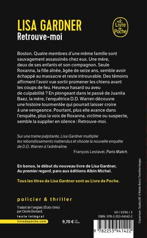 Boston. Quatre membres d’une même famille sont sauvagement assassinés chez eux. Une mère, deux de ses enfants et son compagnon. Seule Roxanna, la fille aînée âgée de seize ans, introuvable, semble avoir échappé au massacre. Des témoins affirment l’avoir vue sortir promener les chiens avant les coups de feu. Heureux hasard ou aveu de culpabilité ? En plongeant dans le passé de Juanita Baez, la mère, l’enquêtrice D.D. Warren découvre une histoire tourmentée, entre alcool, violences et familles d’accueil, qui pourrait laisser croire à une vengeance. Pourtant, plus elle avance dans l’enquête, plus la voix de Roxanna, victime ou suspecte, semble la supplier en silence : Retrouve-moi.