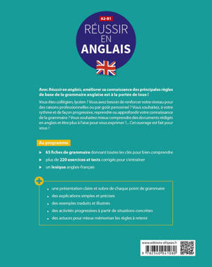 Réussir en anglais convient aussi bien aux élèves de collège et de lycéequ’aux adultes désirant reprendre ou améliorer leur connaissance de la grammaire anglaise à leur rythme. Il permet de réviser et d’approfondir en 65 séquences et 230 exercices et tests corrigés, les principales règles de grammaire anglaise à maîtriser pour mieux s’exprimer et comprendre des documents.