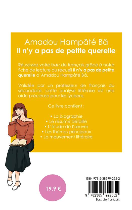 Réussissez votre bac de français 2026 grâce à notre fiche de lecture du recueil Il n'y a pas de petite querelle d'Amadou Hampâté Bâ ! Validée par un professeur de français du secondaire, cette analyse littéraire est une aide précieuse pour tous les lycéens. Grâce à notre travail éditorial, les points suivants n'auront plus aucun secret pour vous : la biographie de l'écrivain, le résumé du livre, l'étude de l'oeuvre, l'analyse des thèmes principaux à connaître et le mouvement littéraire auquel est rattaché l'auteur.