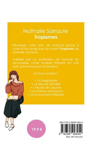 Réussissez votre bac de français 2026 grâce à notre fiche de lecture du roman Tropismes de Nathalie Sarraute ! Validée par un professeur de français du secondaire, cette analyse littéraire est une aide précieuse pour tous les lycéens. Grâce à notre travail éditorial, les points suivants n'auront plus aucun secret pour vous : la biographie de l'écrivain, le résumé du livre, l'étude de l'oeuvre, l'analyse des thèmes principaux à connaître et le mouvement littéraire auquel est rattaché l'auteur.