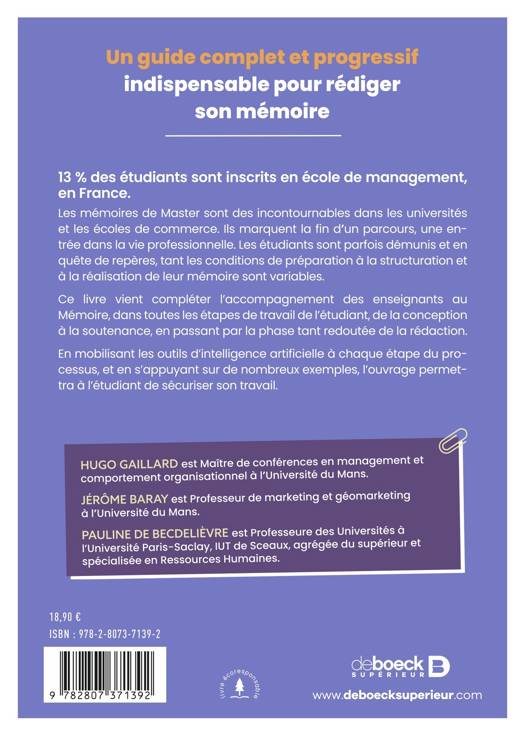 Ce livre vient compléter l’accompagnement des enseignants au Mémoire, dans toutes les étapes de travail de l’étudiant, de la conception à la soutenance, en passant par la phase tant redoutée de la rédaction.