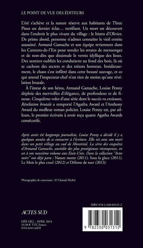 À l'instar de son héros, Armand Gama che, Louise Penny déploie des merveilles d'élégance, de profondeur et de fi - nesse. Cinquième volet d'une série dont le succès va croissant, «Révélation brutale» a remporté l'Agatha Award et l'Anthony Award du meilleur roman policier. Louise Penny est, par ailleurs, le premier écrivain à avoir reçu quatre Agatha Awards consécutifs.
