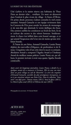 L'été s'achève et la nature réserve aux habitants de Three Pines un dernier éclat... terrifiant. Un mort est découvert dans l'endroit le plus vivant du village : le bistro d'Olivier. De prime abord, personne n'admet connaître le vieil ermite assassiné. Armand Gamache et son équipe reviennent dans les Cantons-de-l'Est pour sonder les strates de mensonges et de non-dits que dissimule le vernis idyllique des lieux. Des sentiers oubliés les conduisent au fond des bois, là où se cachent des secrets et des trésors honteux. Insidieuse - ment, le chaos s'est infiltré dans cette beauté sauvage, et ce qui attend l'inspecteur-chef n'est rien de moins qu'une révélation brutale.