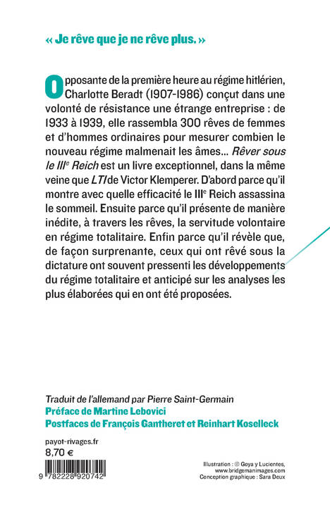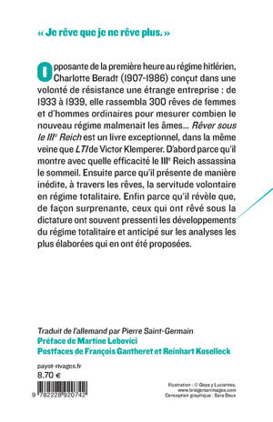 Opposante de la première heure au régime hitlérien, Charlotte Beradt (1907-1986) conçut dans une volonté de résistance une étrange entreprise : de 1933 à 1939, elle rassembla 300 rêves de femmes et d'hommes ordinaires pour mesurer combien le nouveau régime malmenait les âmes... «Rêver sous le IIIe Reich» est un livre exceptionnel, dans la même veine que «LTI» de Victor Klemperer. D'abord parce qu'il montre avec quelle efficacité le IIIe Reich assassina le sommeil. Ensuite parce qu'il présente de manière inédite, à travers les rêves, la servitude volontaire en régime totalitaire. Enfin parce qu'il révèle que, de façon surprenante, ceux qui ont rêvé sous la dictature ont souvent pressenti les développements du régime totalitaire et anticipé sur les analyses les plus élaborées qui en ont été proposées.