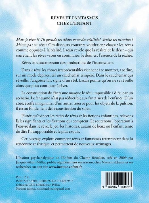 RÊVES ET FANTASMES CHEZ L’ENFANT Institut psychanalytique de l’Enfant du Champ freudien Sous la direction de Angèle Terrier « Mais je rêve !? » « Tu prends tes désirs pour des réalités ! » « Arrête tes histoires ! » « Même pas en rêve ! » Ces discours courants voudraient chasser les rêves comme opposés à la réalité. Lacan révèle que la réalité et le désir – qui entretient les rêves – sont en continuité : le désir est l’essence de la réalité. Rêves et fantasmes sont des productions de l’inconscient. Dans le rêve, les choses irreprésentables viennent à se montrer, à se dire, sur un mode déplacé, tel un cauchemar tempéré. Dans le cauchemar qui réveille, l’angoisse fait signe d’un réel. Lacan pointe qu’on ne se réveille alors que pour continuer à rêver. La construction du fantasme masque le réel, impossible à dire, par un scénario. Le fantasme n’est pas réductible aux fantaisies de l’enfance. D’un côté, étoffe imaginaire, d’un autre, réserve pour les objets de la pulsion, il est au fondement de la constitution du sujet. Plutôt qu’évincer les récits de rêves et les fictions enfantines, relevons là les signifiants et les fixations qui comptent. Et soutenons l’opération à l’oeuvre dans le rêve, le jeu, les histoires, autant de lieux où l’enfant tente de dire l’insupportable et le plus exquis. Cet ouvrage explore comment rêves et fantasmes retentissent dans la rencontre analytique, et permettent de nouveaux arrimages.