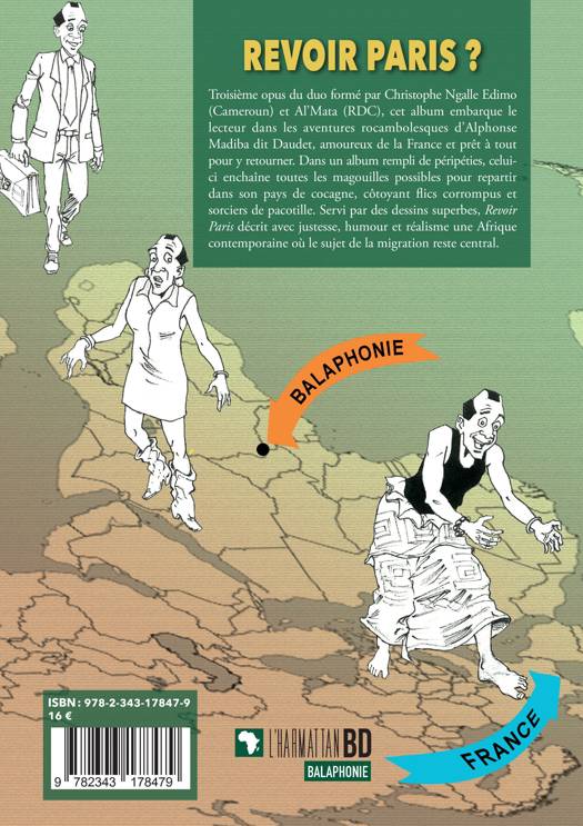 Troisième opus du duo formé par Christophe Ngalle Edimo (Cameroun) et Al’Mata (RDC), cet album embarque le lecteur dans les aventures rocambolesques d’Alphonse Madiba dit Daudet, amoureux de la France et prêt à tout pour y retourner. Dans un album rempli de péripéties, celui-ci enchaîne toutes les magouilles possibles pour repartir dans son pays de cocagne, côtoyant flics corrompus et sorciers de pacotille. Servi par des dessins superbes, Revoir Paris décrit avec justesse, humour et réalisme une Afrique contemporaine où le sujet de la migration reste central.