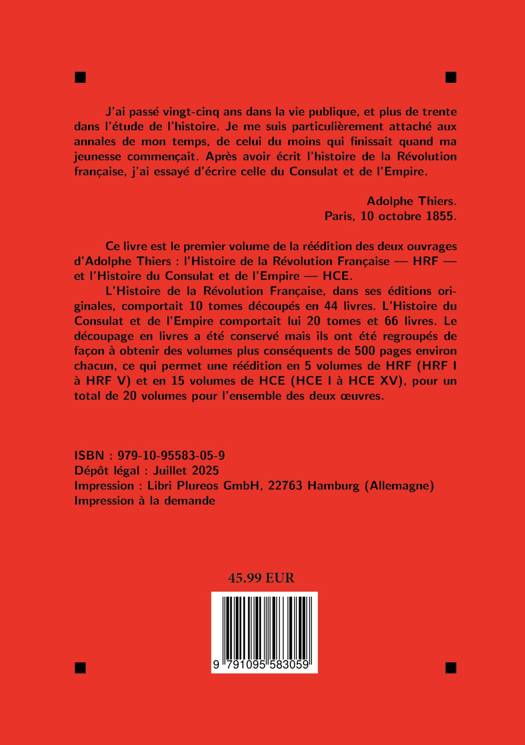 Publiée entre 1823 et 1827, l'Histoire de la Révolution française est la première grande synthèse historique consacrée à cet événement majeur. Adolphe Thiers y retrace, dans un récit à la fois précis et vivant, les étapes de la Révolution, de 1789 à l'avènement de Bonaparte. L'ouvrage, qui connut un immense succès au XIXe siècle, demeure un témoignage essentiel de l'historiographie romantique et un jalon incontournable pour quiconque s'intéresse à l'histoire de la Révolution et à sa réception.