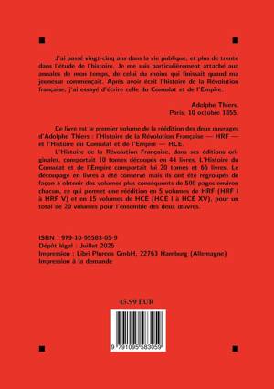 Les deux grandes oeuvres d'Adolphe Thiers, ici réunies, offrent une vaste fresque historique allant de 1789 à 1815. Dans l'Histoire de la Révolution française (1823-1827), l'auteur retrace les bouleversements politiques et sociaux qui marquèrent la fin de l'Ancien Régime et l'émergence d'un ordre nouveau. Avec l'Histoire du Consulat et de l'Empire (1845-1862), il poursuit son récit jusqu'à la chute de Napoléon, en s'appuyant sur une documentation considérable. Ensemble, ces deux monuments de l'historiographie du XIXe siècle demeurent des références incontournables pour comprendre l'enchaînement de la Révolution et de l'épopée napoléonienne, ainsi que leur place dans la mémoire collective.