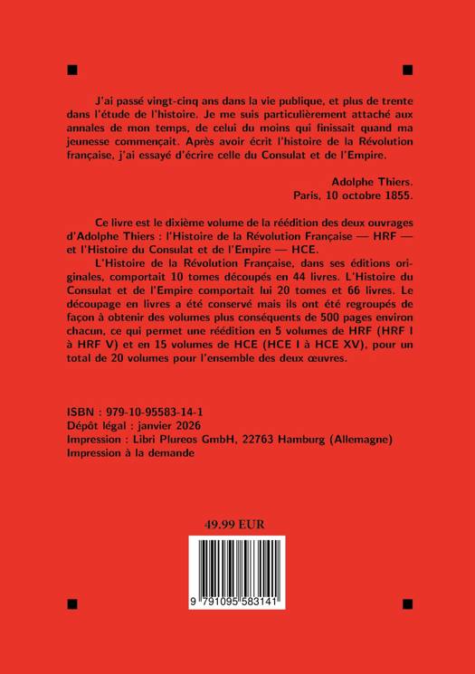 Publiée entre 1823 et 1827, l'Histoire de la Révolution française est la première grande synthèse historique consacrée à cet événement majeur. Adolphe Thiers y retrace, dans un récit à la fois précis et vivant, les étapes de la Révolution, de 1789 à l'avènement de Bonaparte. L'ouvrage, qui connut un immense succès au XIXe siècle, demeure un témoignage essentiel de l'historiographie romantique et un jalon incontournable pour quiconque s'intéresse à l'histoire de la Révolution et à sa réception.