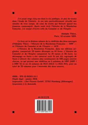 Parue entre 1845 et 1862, l'Histoire du Consulat et de l'Empire constitue l'autre grande fresque historique d'Adolphe Thiers. Poursuivant le récit engagé dans son Histoire de la Révolution française, l'auteur retrace avec minutie les années qui mènent de Brumaire à la chute de Napoléon. Fondée sur un vaste travail documentaire, l'oeuvre allie précision historique et ampleur narrative, offrant l'une des premières grandes synthèses consacrées à l'époque napoléonienne. Elle demeure un jalon majeur de l'historiographie du XIXe siècle et un témoignage essentiel de la construction de la mémoire napoléonienne.