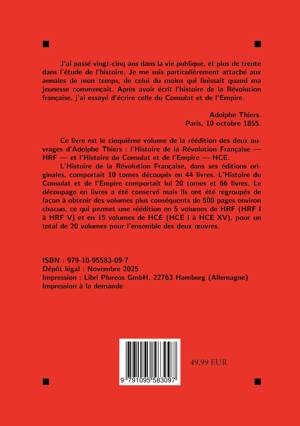 Les deux grandes oeuvres d'Adolphe Thiers, ici réunies, offrent une vaste fresque historique allant de 1789 à 1815. Dans l'Histoire de la Révolution française (1823-1827), l'auteur retrace les bouleversements politiques et sociaux qui marquèrent la fin de l'Ancien Régime et l'émergence d'un ordre nouveau. Avec l'Histoire du Consulat et de l'Empire (1845-1862), il poursuit son récit jusqu'à la chute de Napoléon, en s'appuyant sur une documentation considérable. Ensemble, ces deux monuments de l'historiographie du XIXe siècle demeurent des références incontournables pour comprendre l'enchaînement de la Révolution et de l'épopée napoléonienne, ainsi que leur place dans la mémoire collective.