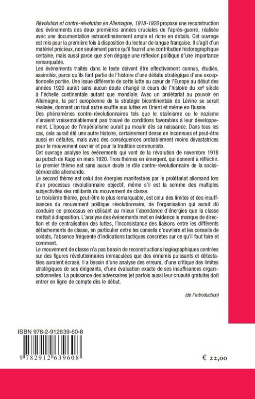 Révolution et contre-révolution en Allemagne, 1918-1920 propose une reconstruction des événements des deux premières années cruciales de l’après Première Guerre mondiale, réalisée avec une documentation extraordinairement vaste et riche en détails. Cet ouvrage est mis pour la première fois à la disposition du lecteur de langue française. Il s’agit d’un matériel précieux, non seulement parce qu’il fournit une contribution historiographique certaine, mais aussi parce que s’en dégage une réflexion politique d’une importance remarquable. Les événements traités dans le texte doivent être effectivement connus, étudiés, assimilés, parce qu’ils font partie de l’histoire d’une défaite stratégique d’une exceptionnelle portée. Une issue différente de cette lutte au cœur de l’Europe au début des années 1920 aurait sans aucun doute changé le cours de l’histoire du XXe siècle à l’échelle continentale autant que mondiale. Avec un prolétariat au pouvoir en Allemagne, la partie européenne de la stratégie bicontinentale de Lénine se serait réalisée, donnant un tout autre souffle aux luttes en Orient et même en Russie.