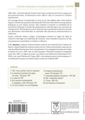 Une synthèse sur la décennie révolutionnaire et l'Empire. La complexité de cette période, la densité des événements imposent ici une approche spécifique : cet ouvrage adopte un plan proche des grandes pulsations révolutionnaires et des principales ruptures survenues au cours de cette période. Sommaire : 1. 1783 : France confinée, France en mouvement 2. La monarchie en question et les appels à la nation : 1783-janvier 1789 3. La rupture de 1789 4. De la monarchie constitutionnelle à la République : juillet 1790-janvier 1793 5. L’an IV de la liberté, l’an I de la République 6. Paroxysmes révolutionnaires : janvier 1793-décembre 1794 7. L’impossible république conservatrice : 1795-1801 8.1802 : la révolution achevée ? 9. L'Empire : 1804-1814 Points forts : - Un manuel de référence sur le sujet - L’ouvrage permet de saisir de façon synthétique tous les enjeux de la question - Le livre est à jour des recherches les plus récentes L’auteur : Jean-Pierre Jessenne est professeur émérite d’histoire moderne de l’université Lille-3-Charles de Gaulle. Public : - Étudiants en histoire - Candidats aux concours de recrutement du secondaire