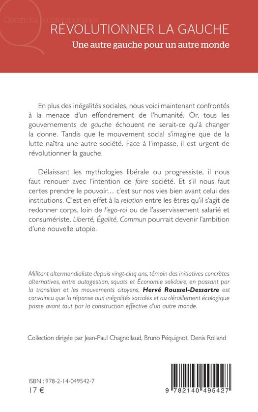 En plus des inégalités sociales, nous voici maintenant confrontés à la menace d'un effondrement de l'humanité. Or, tous les gouvernements de gauche échouent ne serait-ce qu'à changer la donne. Tandis que le mouvement social s'imagine que de la lutte naîtra une autre société. Face à l'impasse, il est urgent de révolutionner la gauche. Délaissant les mythologies libérale ou progressiste, il nous faut renouer avec l'intention de faire société. Et s'il nous faut certes prendre le pouvoir c'est sur nos vies bien avant celui des institutions. C'est en effet à la relation entre les êtres qu'il s'agit de redonner corps, loin de l'ego-roi ou de l'asservissement salarié et consumériste. Liberté, Égalité, Commun pourrait devenir l'ambition d'une nouvelle utopie.