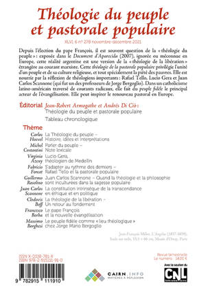 Depuis l'élection du pape François, il est souvent question de la « théologie du peuple » : exposée dans le Document d'Aparecida (2007), ignorée ou méconnue en Europe, cette réalité argentine est une version de la « théologie de la libération » étrangère au courant marxiste. Cette théologie de la pastorale populaire privilégie l'unité d'un peuple et de sa culture religieuse, et tout spécialement la piété des pauvres. Elle est nourrie par la réflexion de théologiens importants : Rafael Tello, Lucio Gera et Juan Carlos Scannone (qui fut un des professeurs de Jorge Bergoglio). Dans un catholicisme latino-américain traversé de courants radicaux, elle fait du peuple fidèle le principal acteur de l'évangélisation. Elle peut inspirer le renouveau pastoral en Europe.