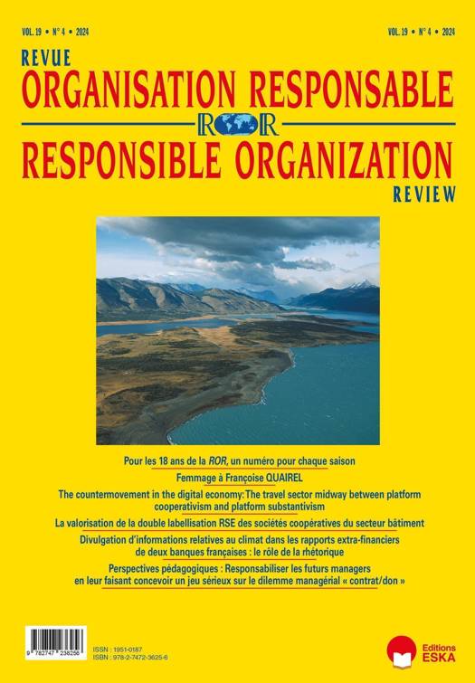 1/ EDITORIAL : Pour les 18 ans de la ROR, un numéro pour chaque saison 2/ La valorisation de la double labellisation RSE des sociétés coopératives du secteur bâtiment 3/ Divulgation d'informations relatives au climat dans les rapports extra-financiers de deux banques françaises : le rôle de la rhétorique. 4/ Responsabiliser les futurs managers en leur faisant concevoir un jeu sérieux sur le dilemme managérial "contrat/don"