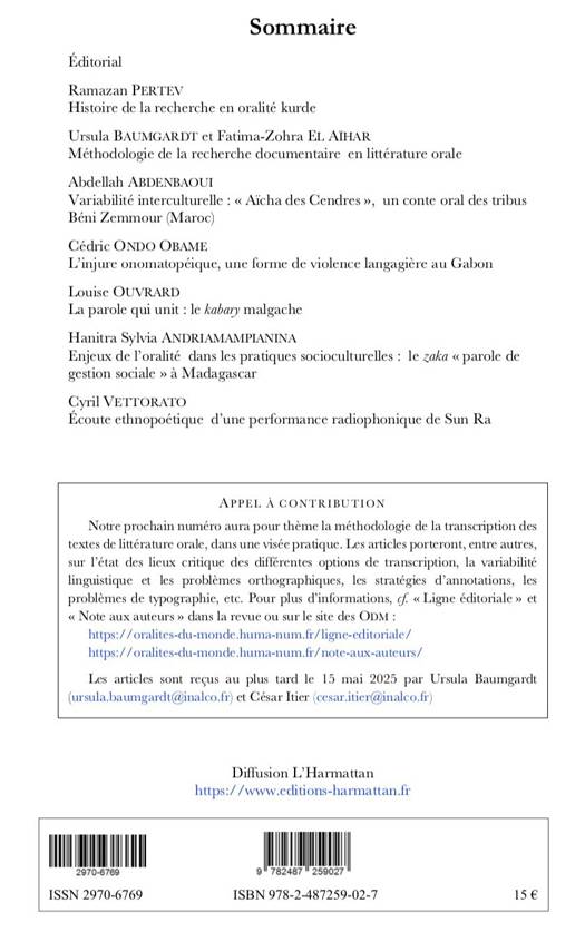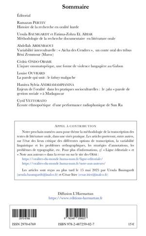 Au sommaire du numéro : ♦ Histoire de la recherche en oralité kurde ♦ Méthodologie de la recherche documentaire en littérature orale ♦ Variabilité interculturelle : « Aïcha des Cendres », un conte oral des tribus Béni Zemmour (Maroc) ♦ L’injure onomatopéique, une forme de violence langagière au Gabon ♦ La parole qui unit : le kabary malgache ♦ Enjeux de l’oralité dans les pratiques socioculturelles : le zaka « parole de gestion sociale » à Madagascar ♦ Écoute ethnopoétique d’une performance radiophonique de Sun Ra